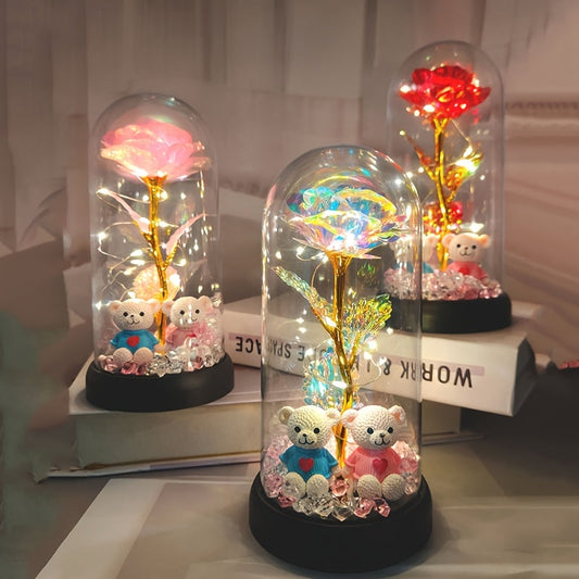 [Christmas Rose & Bear] Christmas Rose & Bear Diamond Crystal Plastic Flower Pot | Battery-Powered (AAA Not Included) | Holiday Gift, Valentine's Day, Mother's Day, Graduation Gifts, Home Decor, Eternal Floral Preserved Bouqu